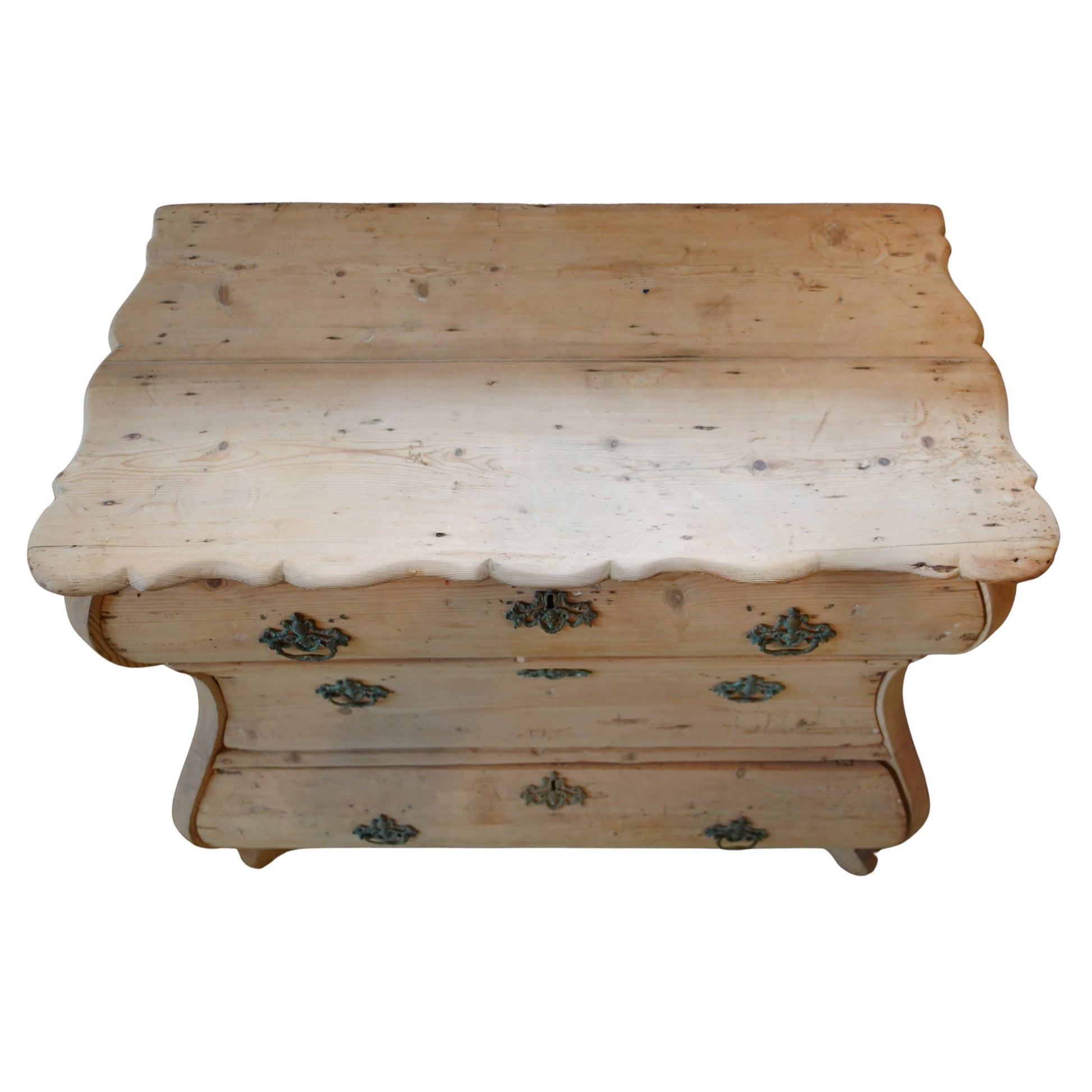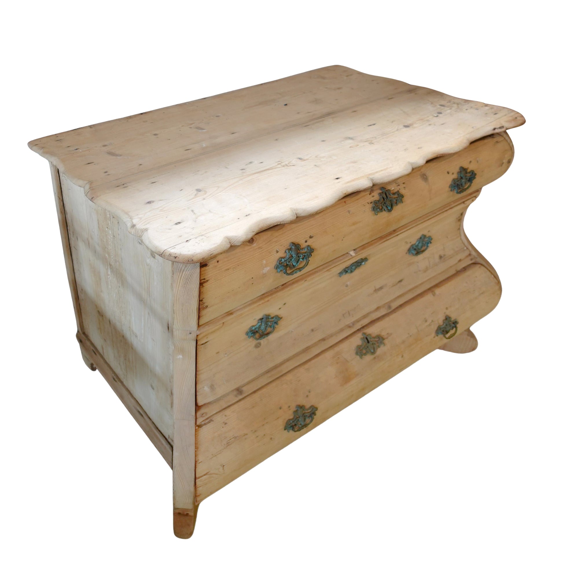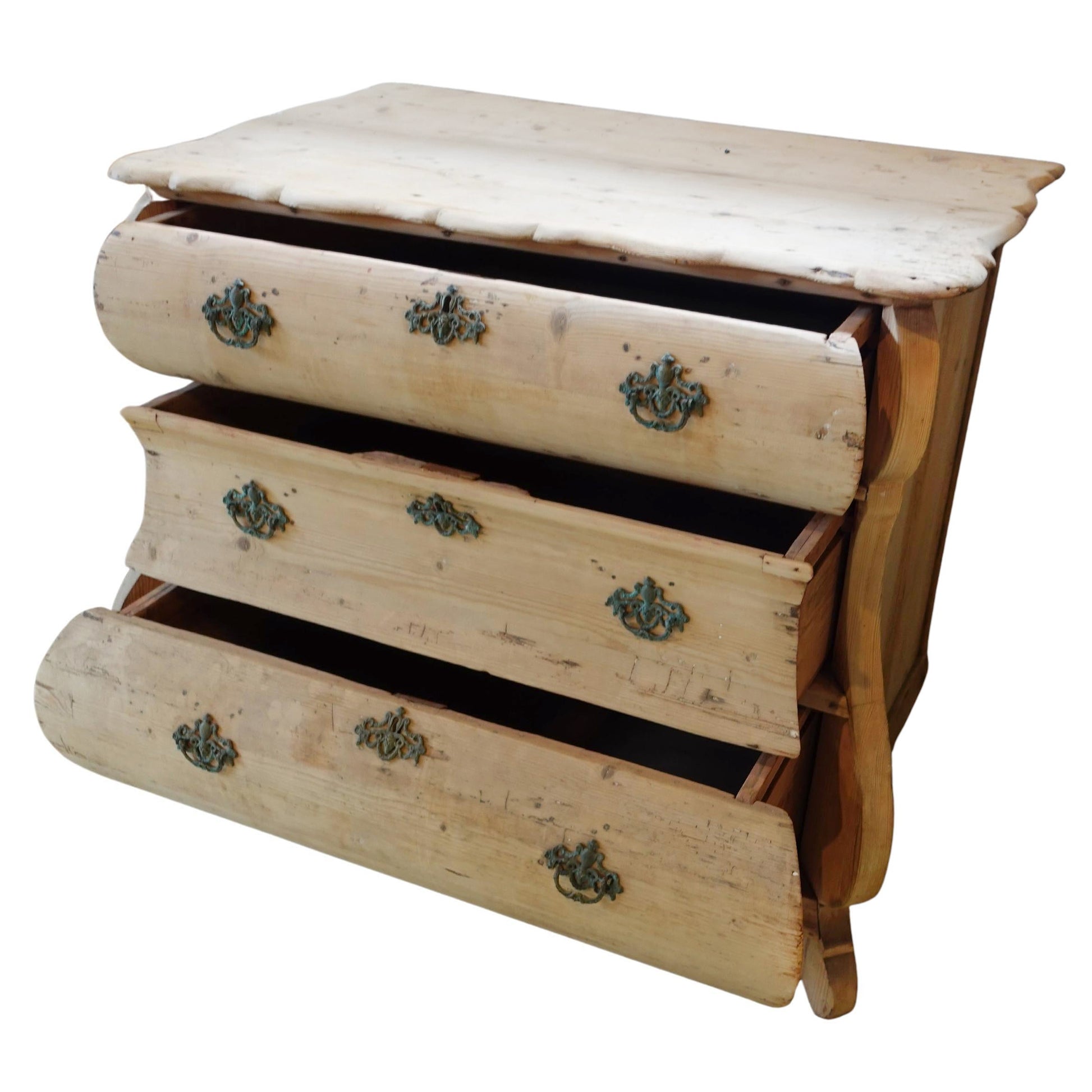 A striking 19th-century Dutch serpentine commode, distinguished by its stripped finish. This treatment showcases its slightly distressed raw beauty and elegant wood grain, while the original hardware adds to its authentic rustic European character.
