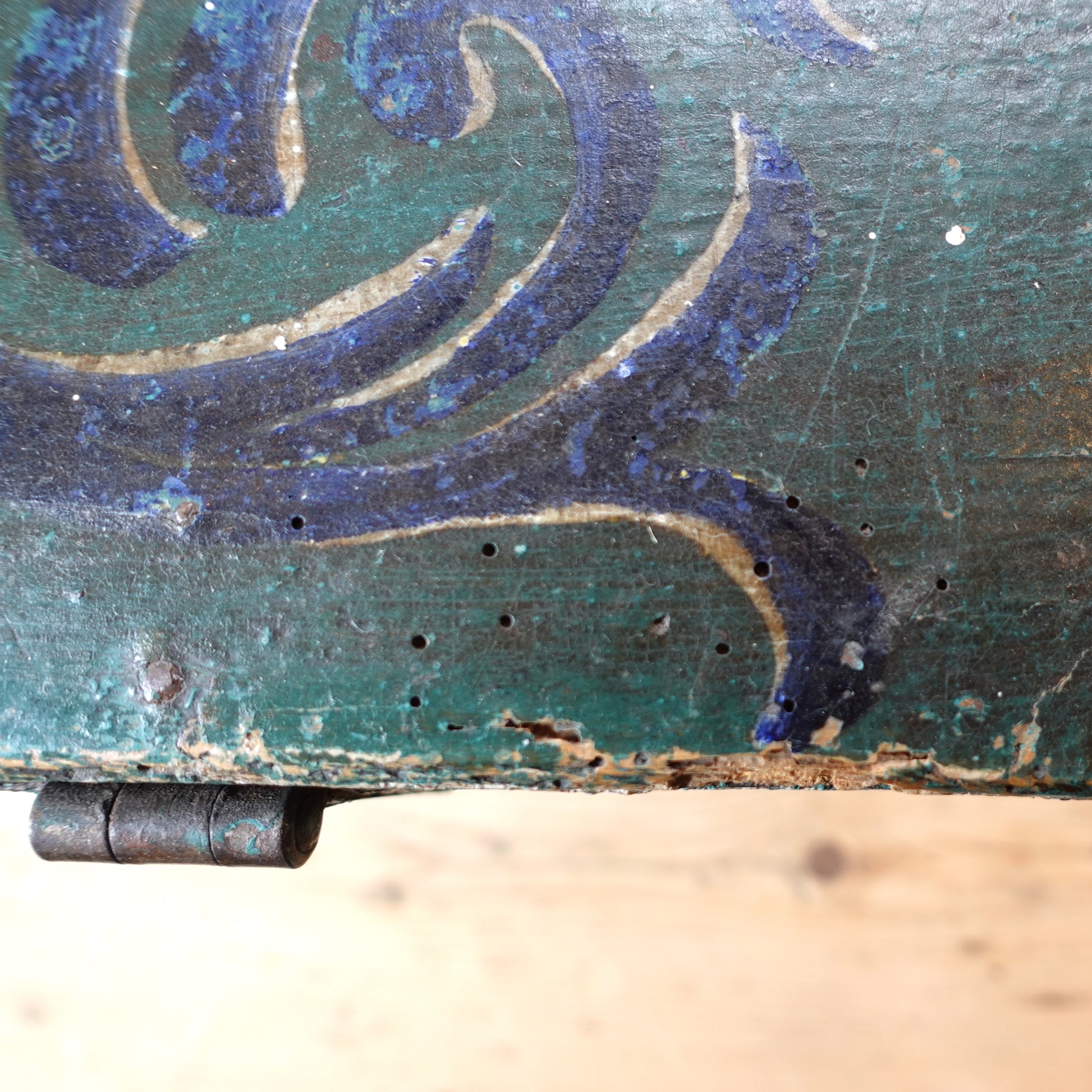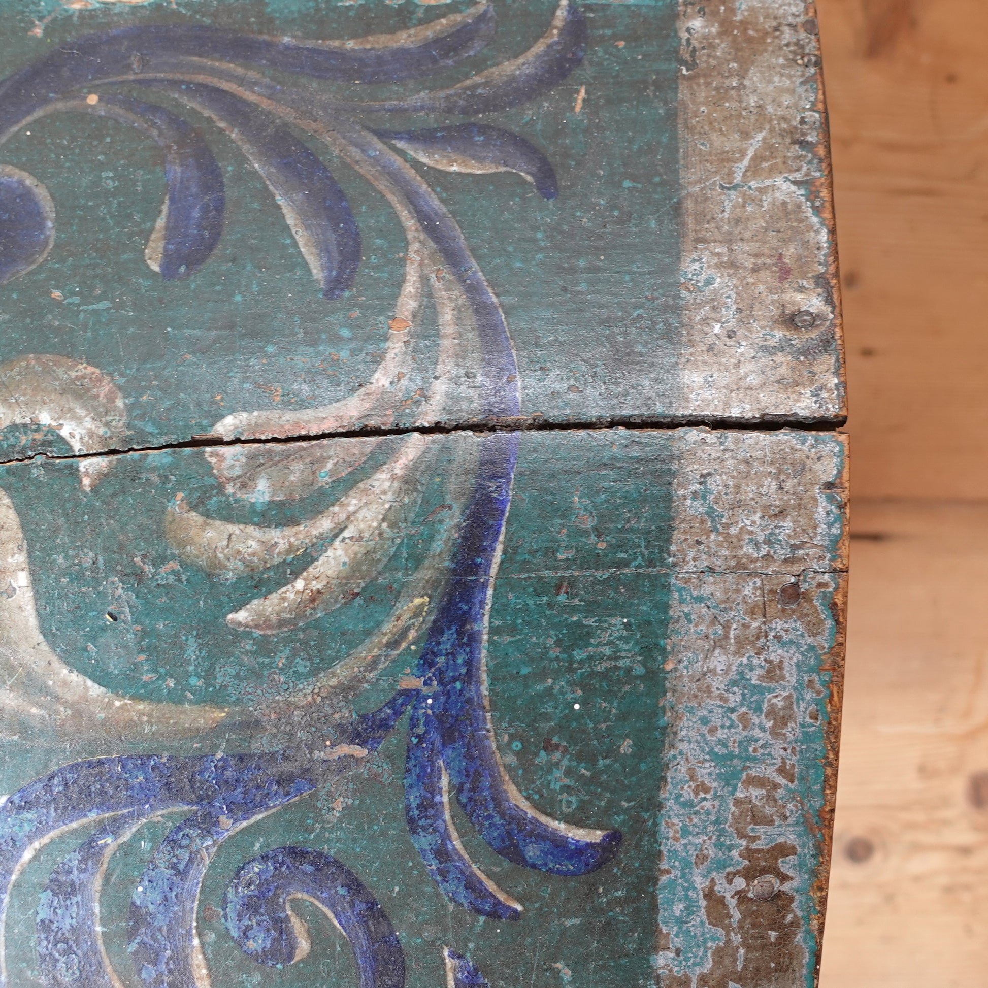 A handsome dome lidded Scandinavian immigrants’ box with a lovely painted green and blue tonal palette with scrolling foliate motifs. A cream stripe runs along the edges and center of the box, possibly in imitation of where iron reinforcing mounts would normally appear on larger variants of this utilitarian artform. The edges taper downward and provide a very simple yet eloquent design. The painted motifs of are simple and beautiful and elevate the overall charm of this handmade antique.