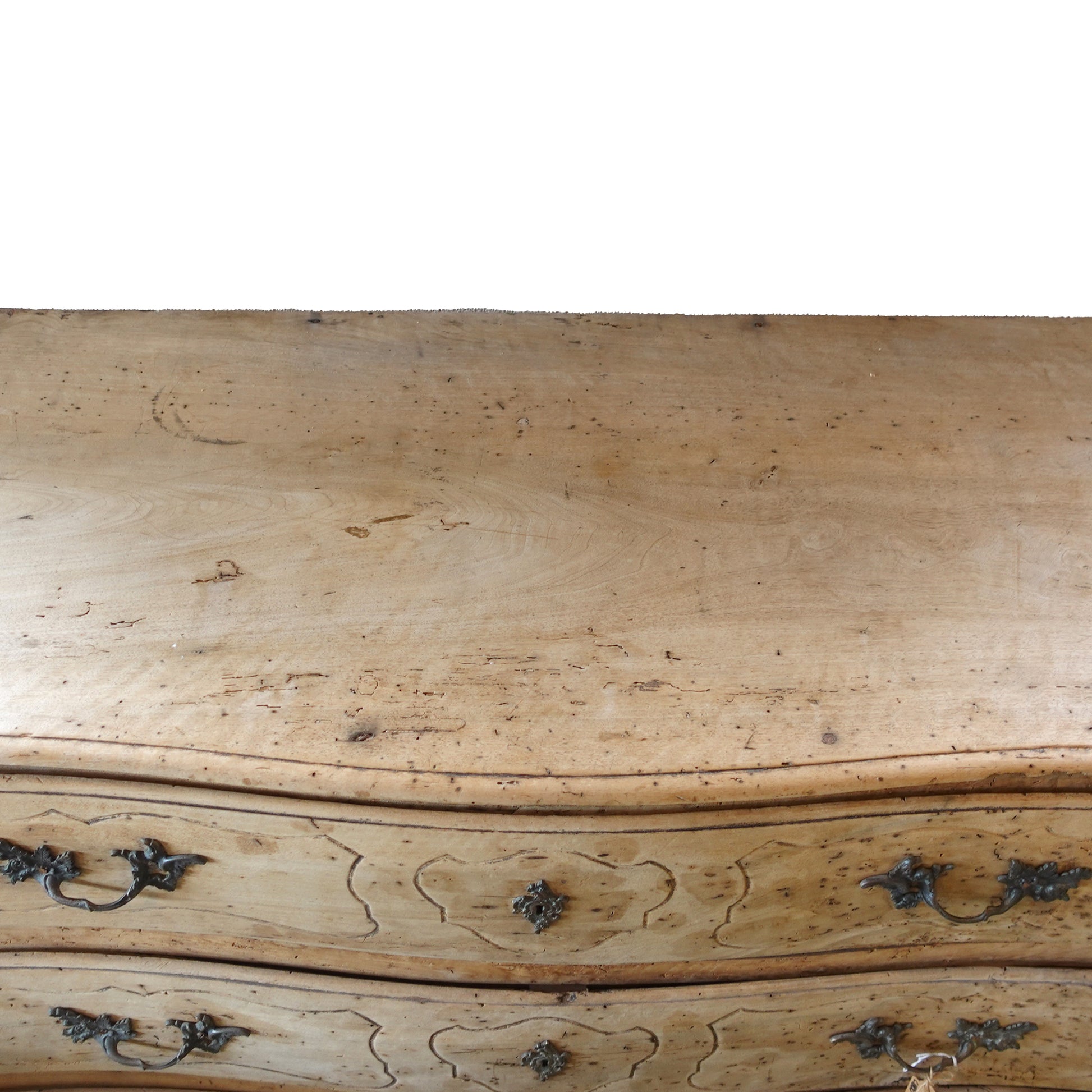 A handsome serpentine fruitwood chest of French design. Its original finish has been bleached to produce a highly interesting visual texture and surface patina. The original grooved cartouche-style design motifs chased onto the surface of the drawers remain and outline the brass hardware and locks which have been darkened and feature a slight verdigris. A silhouetted base compliments its sleek design and this manner carries into the silhouetted cabriole legs. The drawers are dovetailed and feature their original locks but lack their keys.