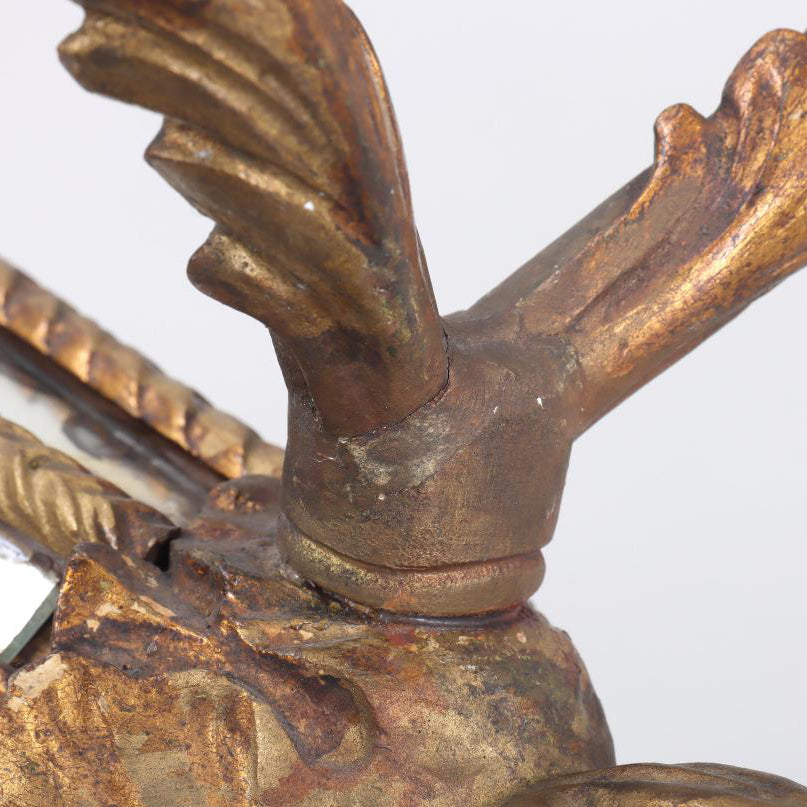 Condition: Wear commensurate with age. Desilvering of the glass mirrors, minor hairline cracks and loss to some gilding throughout. One sconce has repairs and a small loss. Waxy residue is present on the candelabra arms due to antique use.